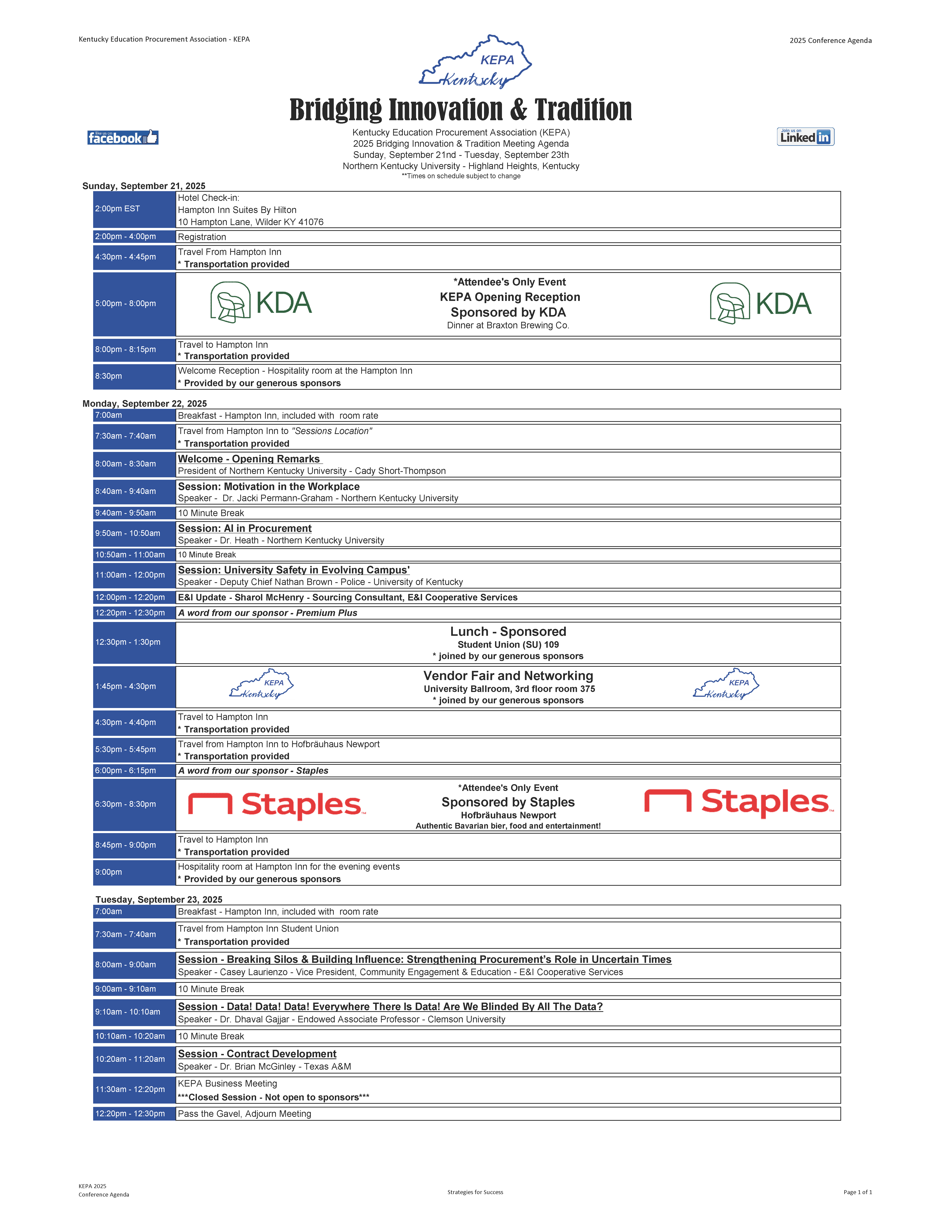 ByadminWe are proud to announce that the Kentucky Education Procurement Association’s member registration for the Second Annual Conference is now open! This year’s theme is Bridging Innovation and Tradition and will take place at Northern Kentucky University from September 21-23, 2025. We have a great conference put together and can’t wait to see you this…